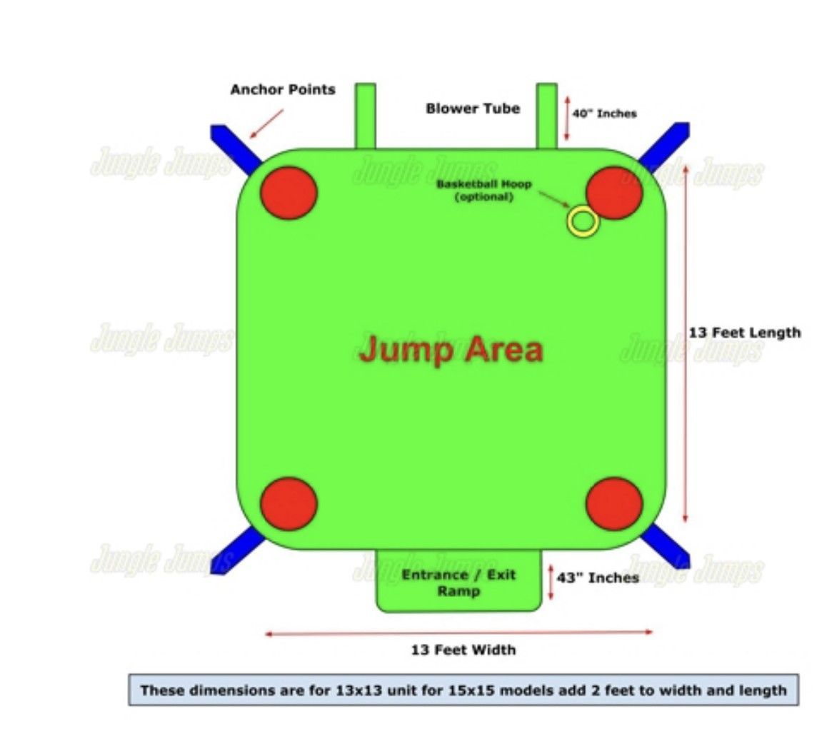 - Occupancy: A maximum of 5-6 kids at a time for bounce houses and 1 person at a time for slides is what most manufacturers recommend